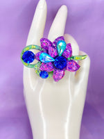 'Starlit Blossom Ring Design' invites you to step into a garden of blossoms under the stars. This exquisite piece showcases two blossoms intertwined with gracefully curving leaves, echoing the gentle rhythm of an evening breeze. Meticulously hand-painted and hand-embellished with faceted glass stones, laser-cut sequins, and a glittery finish, the petals radiate a celestial glow. This piece transforms floral elegance into wearable art, where imagination, couture craftsmanship, and the magic of starlit blossoms converge in a radiant, storybook ring.