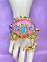 'The Enchanted Carriage Bracelet Design' is a couture creation that transforms playful imagination into wearable art. This captivating piece features a dimensional, hand-painted carriage in pearly pink and blue hues, meticulously crafted to evoke storybook charm. The magical centerpiece is hand-embellished with gold-tone decorative gilding and sparkling faceted glass stones, catching the light with every movement. A delicate gilded horse charm dangles from the carriage, adding a touch of dynamic elegance and narrative whimsy. Bold, joyful, and unapologetically unique, this bracelet is a statement piece for those who cherish artistry, craftsmanship, and the joy of wearable art.