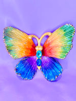 A vivid expression of craftsmanship and couture creativity, the 'Tropical Butterfly Brooch' is a striking statement piece. Meticulously hand-painted in a gradient of vibrant rainbow hues, it is adorned with faceted oval glass stones in rich blue tones. Delicately hand-embellished with decorative gold-tone gilding, the piece is enhanced with refined opulence. Finished with a secure metal pin fastening, this brooch is a true wearable work of art.
