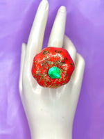 Celebrate the magic of the harvest season with this couture statement ring, featuring a hand-painted dimensional pumpkin figure. Meticulously hand-embellished with delicate decorative gilded detailing, this whimsical yet refined piece captures the essence of autumn enchantment. Its adjustable design ensures a perfect fit for any finger.