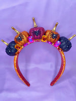 The 'Enchanted Pumpkin Headband Design' transforms the magic of autumn into a couture statement. Hand-painted and hand-embellished, this wearable art piece glimmers with faceted glass stones and gold-tone decorative gilding, catching the light with every movement. Glittering in rich autumnal hues, the pumpkins are playfully adorned with sparkling spider figures, adding a touch of whimsical charm. Meticulously crafted with exquisite attention to detail, this headband turns seasonal enchantment into bold, storytelling style.