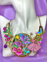 Step into a fairytale storybook with this enchanting couture neckpiece. Each piece is meticulously hand-painted in dreamy hues and hand-embellished, making it a true work of art. At the centre of this design, a decorative hand-gilded metal plaque is transformed into a whimsical fairy garden: a delicate ballerina dances gracefully with a fluttering butterfly, surrounded by lush strawberries, vibrant blossoms, and a tropical bird, all painted in a symphony of dreamy hues. This masterpiece is a wearable fairytale, designed to transport you to a realm where whimsy and beauty merge.
