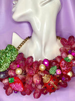 A bold couture statement piece that reflects nature's rich abundance. A hand-embellished, lush grape cluster in deep burgundy, crimson, and purple hues curves elegantly around the neck. A vivid green leaf sparkles with glitter, while a jewel-like ladybird glistens between beaded strawberry forms. This piece is a wearable work of art, capturing nature's beauty and opulence in every detail.