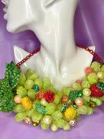 A masterful expression of nature's opulence, the 'Green Grape Neckpiece' is a couture creation featuring a meticulously hand-embellished, lush grape cluster in radiant green, yellow, and orange hues that curves gracefully around the neck. Vivid green leaves sparkle with glitter, while playful adornments—lemons, a strawberry, and red rose figures—offer a touch of surreal charm. The piece is completed with a striking adjustable red metal chain, designed as a wearable work of art that captures nature's beauty in every detail.