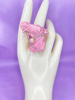 An ethereal wearable artwork, couture 'Horse of The Pearly Moon Ring Design' captures the magic of a moonlit dreamscape. Hand-painted in a soft pearly pink tone that shimmers with delicate lustre, the design reflects the elegance and grace of a mythical horse beneath the glow of a celestial pearly moon. Each piece is meticulously hand-embellished with iridescent glass gems that catch the light from every angle and finished with a single lustrous pearly bead for a final touch of enchantment.