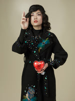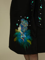 A true statement piece, the 'Lady Greensleeves Couture Coat Design' from the iconic 'God Save the Queens Collection' is a true masterpiece by Cansu Odemis. It features the designer’s hand-drawn illustration of a crowned queen rising from the ashes like a mythical phoenix, alongside a regal key motif — the one and only key believed to unlock the heart of the queen. These storytelling artworks are transformed into digital prints, then meticulously hand-beaded, hand-embellished, and embroidered — blending modern craftsmanship with timeless symbolism.