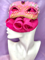 Unveil a world of elegance with Cansu Odemis' couture 'Masquerade Headpiece Design'. This statement fascinator showcases a fully handmade masquerade mask, meticulously hand-painted in rich pink and gold tones. Hand-embellished with pearly pink beads and faceted holographic glass stones to perfection. An exquisite, show-stopping accessory that transforms any look into a captivating work of art.