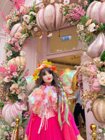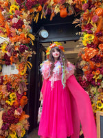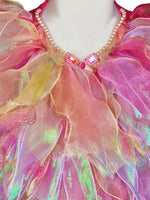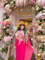 Step into an enchanted forest with the couture 'Nymph Cape Design'. A celebration of enchantment, this wearable art piece evokes blooming gardens and woodland glades. Hand-cut layers of colourful gradient organza cascade with fluid movement, reminiscent of an ethereal water nymph. Each layer is meticulously hand-stitched, shimmering with every gesture, and floats like the delicate wings of a whimsical forest nymph. Completed with ruffled tulle trims, the hand-beaded collar catches the light, framing the wearer in celestial brilliance. A must-have statement piece for colourful festivals, whimsical parties, and every moment where magic is called for. To wear this exclusive 'Nymph Cape Design' is to live within a story where nature and fantasy intertwine, a piece as ethereal and luminous as the nymph herself.