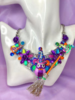 Where whimsical imagination meets couture craftsmanship, the 'Owl Witch Neckpiece' is a hand-painted and hand-embellished statement piece. At its centre, a whimsical witch owl casts charm and colour with a decorative silver-tone gilded broomstick. Surrounded by radiant florals and miniature witch hats, the composition comes to life in vivid gemstone-inspired hues, metallic finishes, and dazzling embellishments. A bold couture creation for those who dress to enchant.